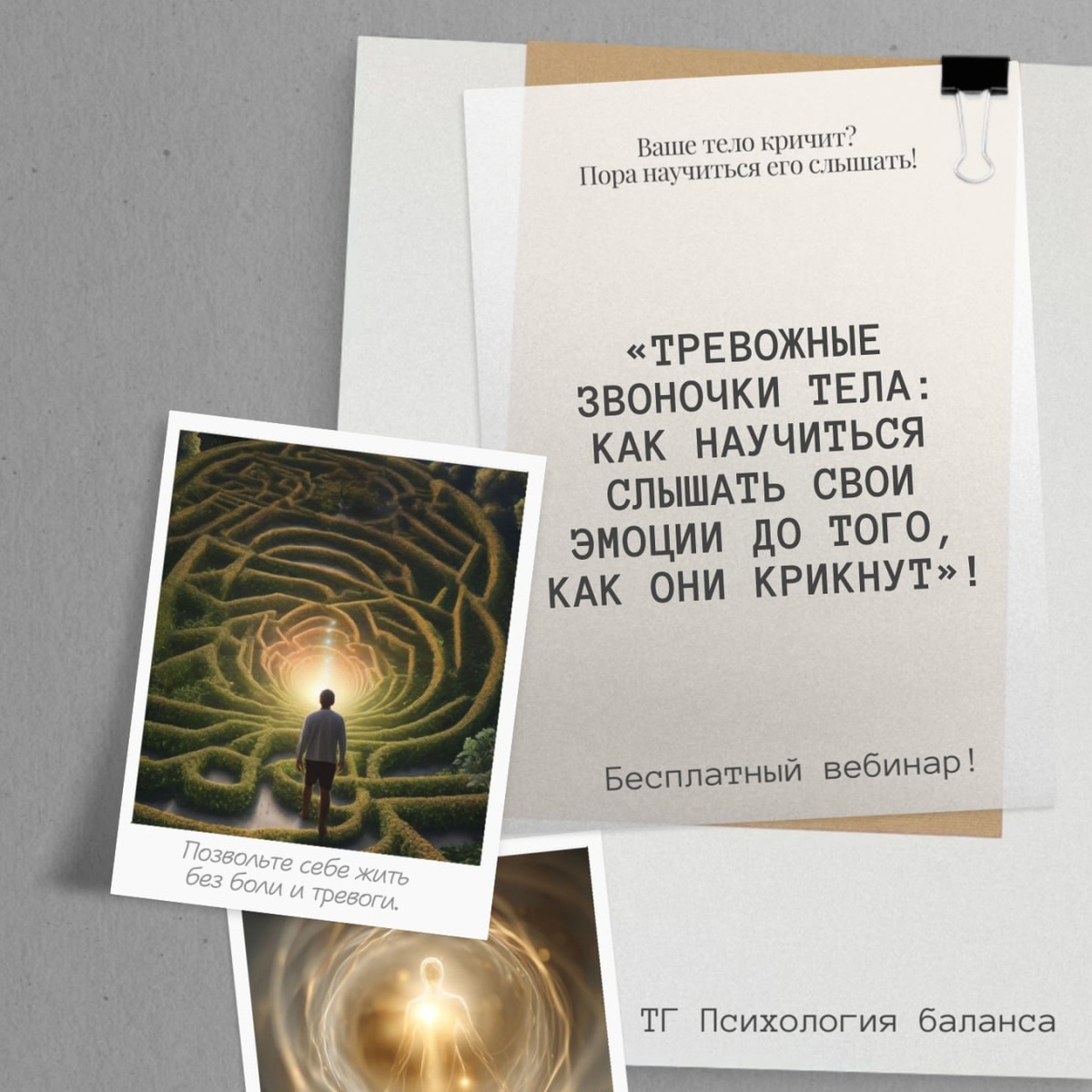 Привет, дорогие! 👋 Как часто вы игнорируете легкое недомогание, хроническую усталость или непонятные боли? Думаете: "Пройдет само"? А потом тело начинает "кричать" болезнями, паническими атаками, срывами... Наше тело — самый честный собеседник. Оно постоянно посылает нам сигналы о наших невыраженных эмоциях, стрессах и внутренних конфликтах. Это и есть психосоматика. И если научиться понимать этот язык, можно предотвратить многие проблемы со здоровьем и обрести внутреннюю гармонию! Приглашаю вас на БЕСПЛАТНЫЙ вебинар «Тревожные звоночки тела: как научиться слышать свои эмоции до того, как они крикнут»! Что вас ждет на вебинаре: ✅ Развеем мифы о психосоматике: что это и как работает. ✅ Научимся расшифровывать язык тела: о чем говорят головная боль, усталость, проблемы с ЖКТ. ✅ Поймем, какие эмоции чаще всего "прячутся" в теле. ✅ Практические упражнения, чтобы начать слышать себя уже во время вебинара! ✅ Узнаете, как предотвратить "крик" тела и жить в балансе. Когда:20 сентября Гд