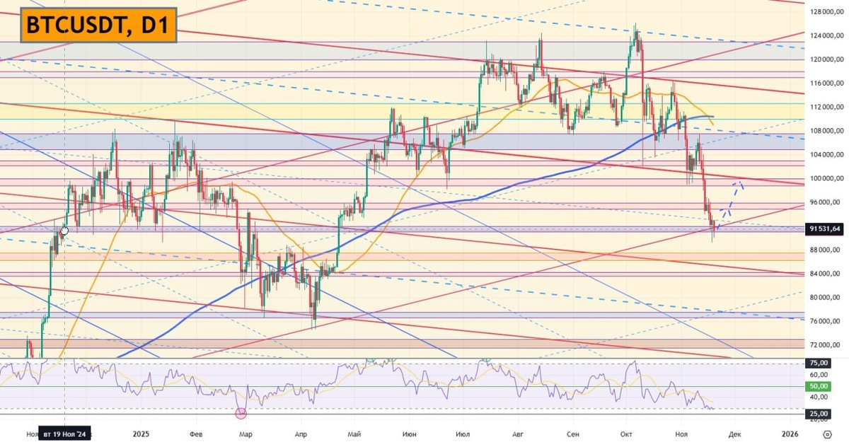 💰📈📉Если бы вы купили Bitcoin год назад - то сейчас ваша прибыль составила бы 0%😃 👉Спустя год цена BTCUSDT вернулась к диапазону 91100 - 92000. Кстати, год назад эти отметки были важным уровнем поддержи, а цена BTC находилась в канале с поддержкой 91100 - 92000 и сопротивлением 104900 - 107500 с 19 ноября 2024 по 24 февраля 2025. 💡Как минимум, текущие отметки являются хорошей точкой для коррекции до 98800 - 100000.