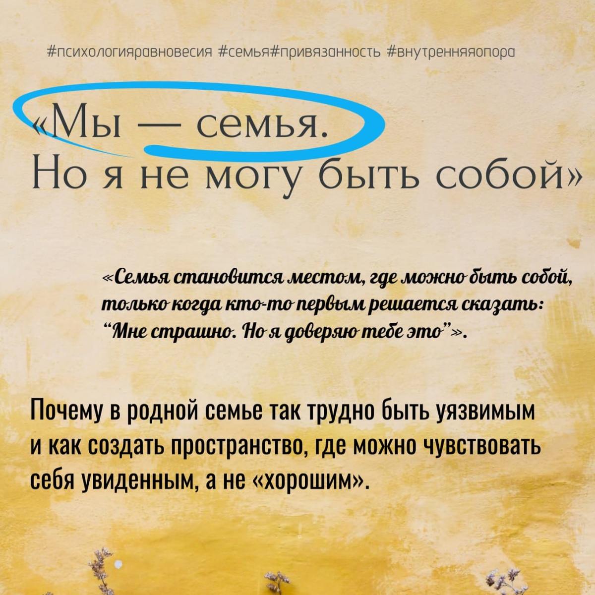 «Мы — семья. Но я не могу быть собой» Почему в самых близких отношениях так трудно говорить о чувствах❓ 📎Многие из нас выросли с убеждением: «Семья — это там, где любят без условий». Но на деле часто получается иначе: — злость — «ты всё портишь», — грусть — «хватит ныть», — страх — «не капризничай», — просьба о поддержке — «разберись сам». ➡️И тогда мы учимся скрывать себя, чтобы «сохранить мир». А внутри растёт одиночество — даже среди самых близких людей. Это не «странно» и не «неблагодарно».🔄 Это естественная реакция на отсутствие эмоциональной безопасности. Потому что близость возможна только там, где можно быть уязвимым. ↙️Что произойдёт, если ничего не менять? 🟣Вы привыкаете быть «хорошим», но не настоящим. 🔴Разговоры сводятся к бытовым темам: кто купил хлеб, когда будет ремонт, как дела на работе. 🟣Эмоции уходят внутрь и превращаются в тревогу, раздражение или хроническую усталость. 🔴Семья становится «безопасной тюрьмой»: всё стабильно, но душа задыхается. За годы пра
