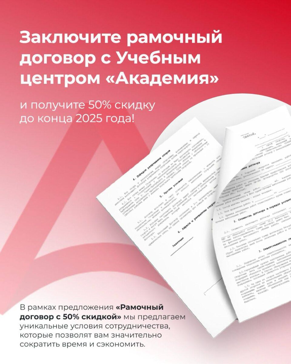 Рамочный договор – стабильное и выгодное партнерство! В рамках предложения «Рамочный договор с индивидуальной скидкой» мы предлагаем уникальные условия сотрудничества, которые позволят вам значительно сократить время и сэкономить. Что значит «рамочный договор»: 🤩 Вы заключаете с нами договор и получаете курсы за половину до конца 2026 года. 🤩 Это выгодно для тех, кто планирует регулярно учиться и готов инвестировать в развитие сотрудников (или свой собственный рост). 🤩 Условия простые, а эффект может быть долгосрочным — скидка распространяется на множество программ, а не только на один курс. Актуально для юридических лиц. 🔎 Узнать подробнее