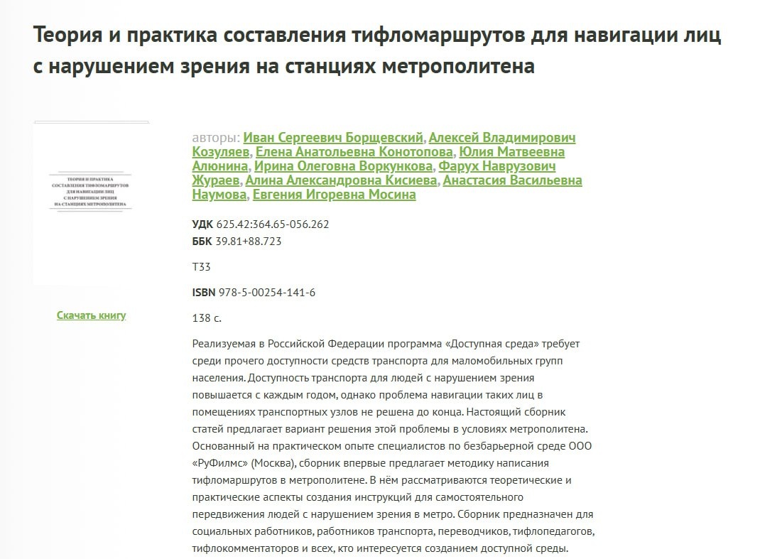 #работа #РуФилмс #инклюзия #доступнаясреда Смотрю публикации в тематических пабликах и радуюсь и горюю одновременно. В прошлом году, в рамках исполнения госконтракта, мы создали за 3 месяца всего, тифломаршруты для 293 станций московского метро. К сожалению, они так и не попали к пользователям. Почти 70 человек обучилось и работало на проекте. Люди положили своё лето на полочку, чтобы успеть в срок сделать уникальную и сложнейшую работу. Которую до нас никто в мире не сделал в такие сроки и с такой самоотверженностью. Но мы обобщили свой опыт и издали методичку. Возможно, она поможет другим группам и специалистами, которые работают над созданием тифломаршрутов на транспорте. Ну а мы только сейчас организуем небольшое мероприятие в Москве (напишу отдельно). На нём можно будет пообщаться с редакторами проекта, ставшими авторами методики. Книга передана на поглавную и общую индексацию в РИНЦ. Электронная версия нашей методички уже доступна вот тут Ни в коем случае не хочу обесценивать р