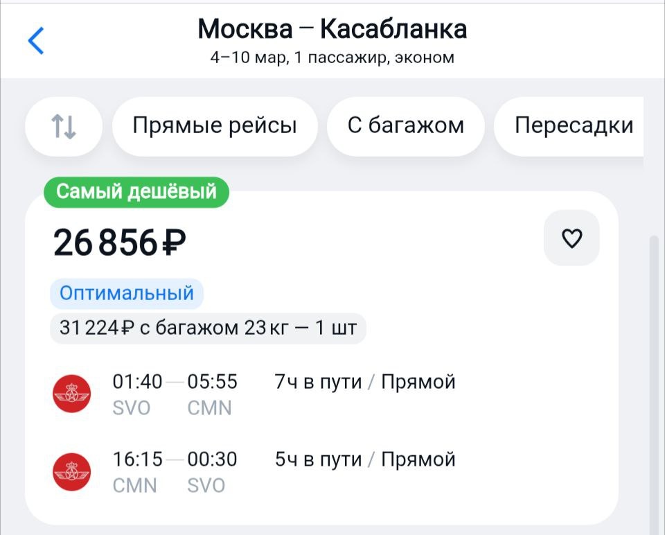 Админ, дай что-нибудь эдакое! Пожалуйста, Марокко на 8 марта. Оооочень крутая цена, да ещё и с багажом. А как до Москвы, решайте сами. https://aviasales.tpm.lv/wCdhvlaK #CMN @KJA