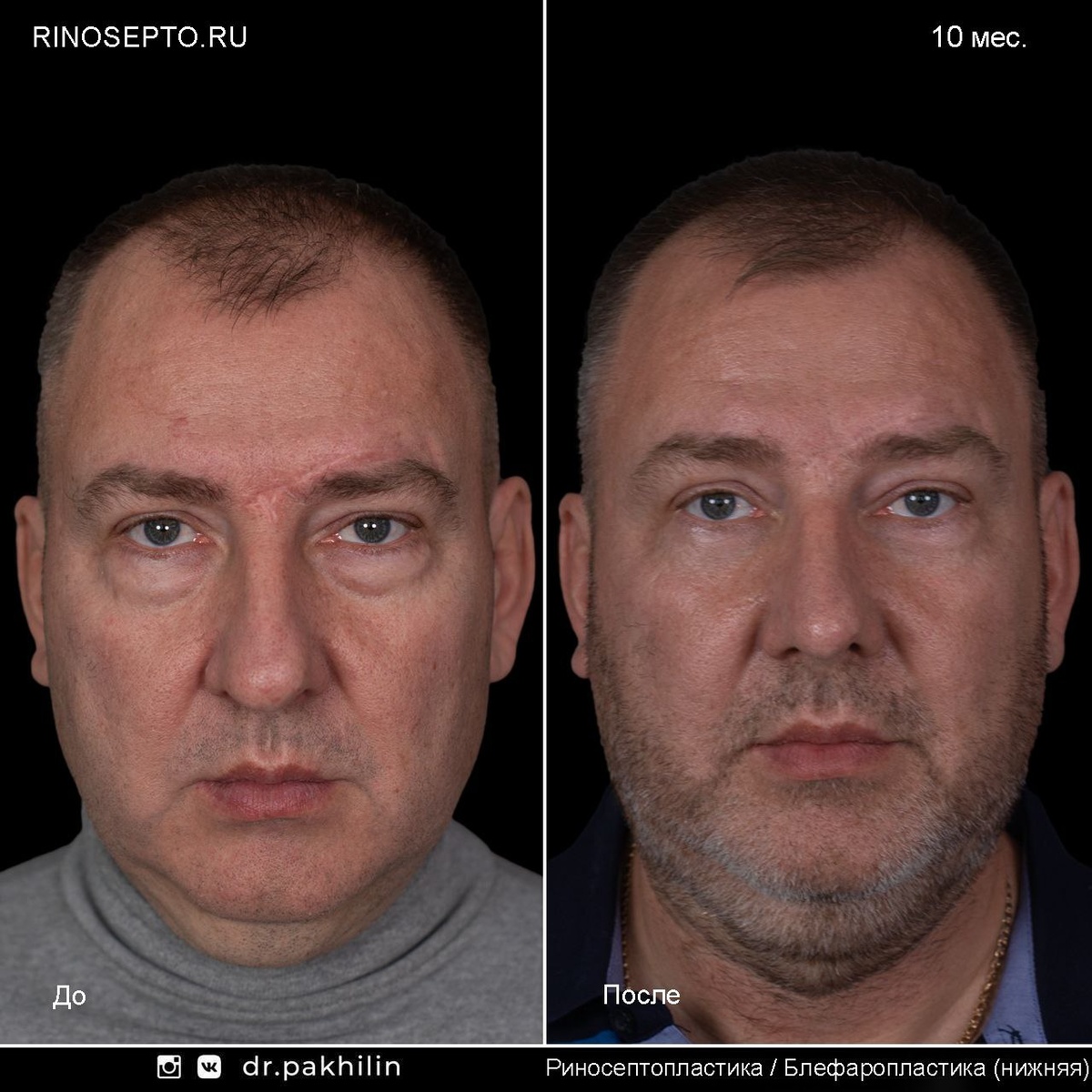 #РИНОПЛАСТИКА #БЛЕФАРОПЛАСТИКА #ДМИТРИЙ_ПАХИЛИН Пластические операции для мужчин без следов хирургического вмешательства ❗Ринопластика и блефаропластика как первый этап в антивозрастной хирургии ▫️С возрастом мягкие ткани человека подвергаются естественному процессу возрастной атрофии. В сочетании с гравитацией формируются: - нежелательные удлиненные формы носа, - провисание щек, - формирование грыж нижних век. - Дополнительно отмечается увеличение хрящей носа, обусловленное генетической особенностью. Поэтому с возрастом носы у некоторых пациентов имеют бульбообразность и приобретают удлинённую форму. ▫️На нижних веках происходит атрофия подкожно-жировой клетчатки с более выраженным проявлением жировых грыж ввиде «мешков» под глазами. Их наличие не связано с патологическим состоянием организма! ▫️Под действием гравитации мягкие ткани лица так же подвержены птозу, щеки сползают в нижние отделы лица с формированием «брылей» 🔻С целью омоложения лица мы предложили пациенту ступен
