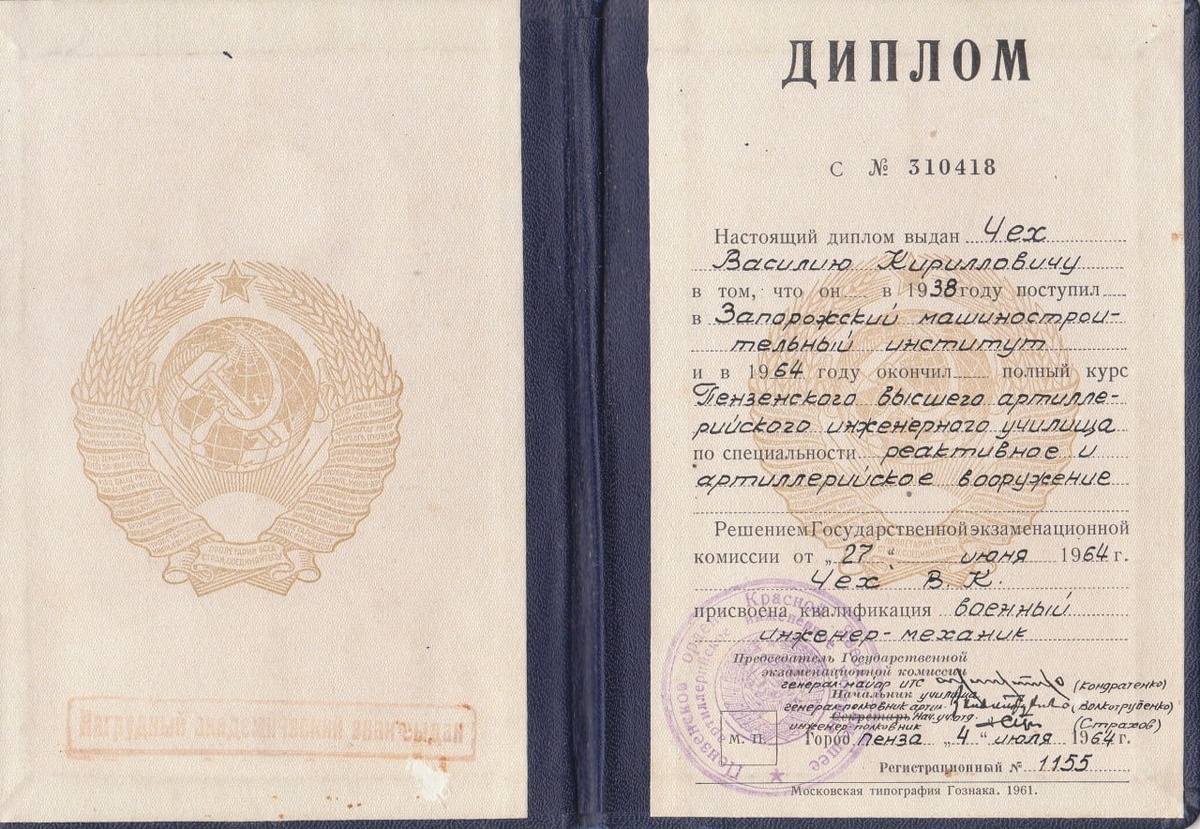 Диплом об окончании Пензенского высшего артиллерийского инженерного училища майором Чех В