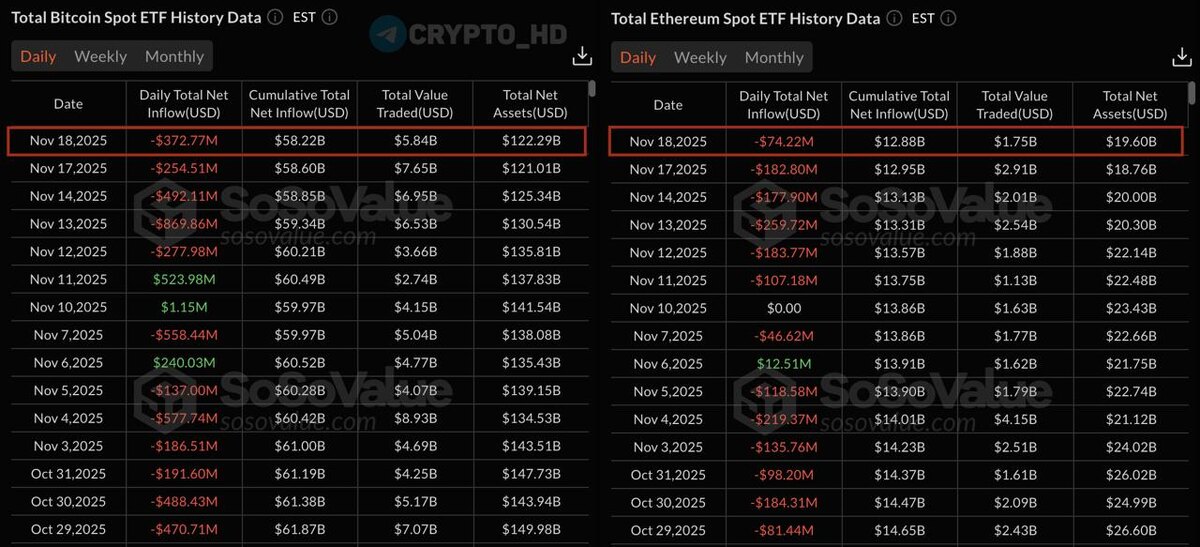 Bitcoin ΠΈ Ethereum ETF. Π§ΠΈΡΡΡΠΉ ΠΎΡΡΠΎΠΊ Π·Π° Π²ΡΠ΅ΡΠ°ΡΠ½ΠΈΠΉ Π΄Π΅Π½Ρ: βͺ#BTC = -$372,770,000. βͺ#ETH = -$74,220,000. Crypto Headlines