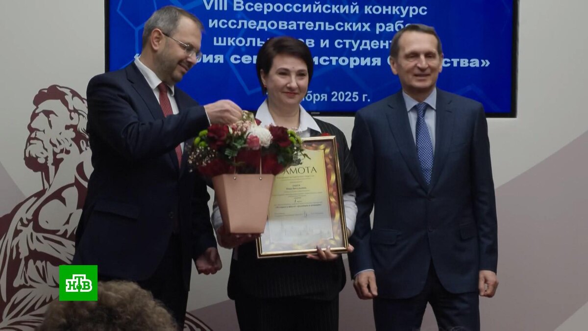 [ Смотреть видео на сайте НТВ ] В столице вручили награды финалистам двух конкурсов — «История в школе: традиции и новации» и «История семьи — история Отечества». В первом конкурсе участвовали преподаватели из российских регионов и из-за рубежа. Второй проводили для учеников старших классов и студентов: молодежь представляла свои исследовательские работы. В этом году конкурс посвятили годовщине Победы в Великой Отечественной войне. Председатель Российского исторического общества Сергей Нарышкин особо отметил главенствующую роль таланта и профессионализма учителей. Сергей Нарышкин, председатель Российского исторического общества, директор Службы внешней разведки: «Преподавание истории Великой Отечественной войны — это не простое запоминание фактов, последовательности событий, а нравственное осмысление великого подвига, совершенного нашим народом». Грамоты Российского исторического общества получили педагоги из Абхазии, Киргизии и Молдавии. В числе российских победителей — преподаватели