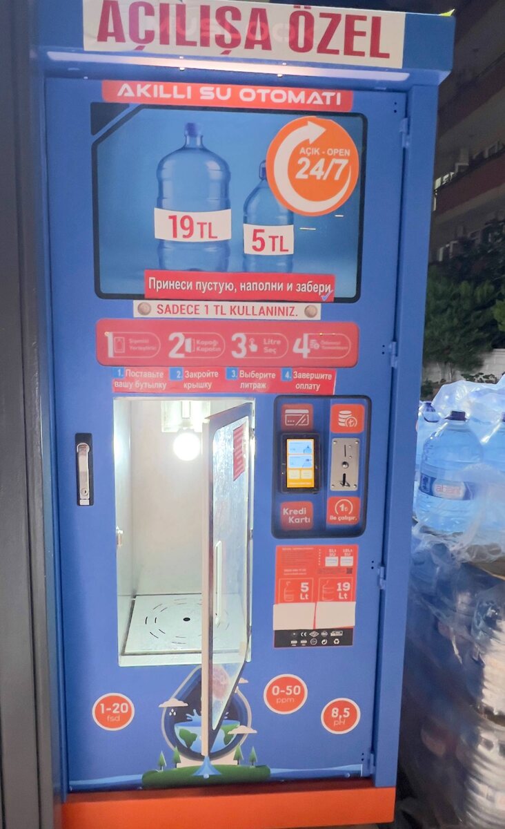 💧 1 литр воды за 1 лиру — в Турции это реально! В разных районах Турции начали появляться умные автоматы для розлива питьевой воды. Принцип простой: приносишь свою бутылку, ставишь в автомат — и наполняешь всего за 1₺/литр. Такие аппараты уже встречаются в Алании и Махмутларе: – работают 24/7, – принимают наличные и карты, – можно налить как 1 литр, так и 5-литровую бутыль — и тоже за символическую цену. ♻️ Формат стал популярен у тех, кто заботится о бюджете и хочет использовать многоразовые бутылки, снижая пластик. Подписывайтесь на наш канал LifeinTurkeyRestProperty
