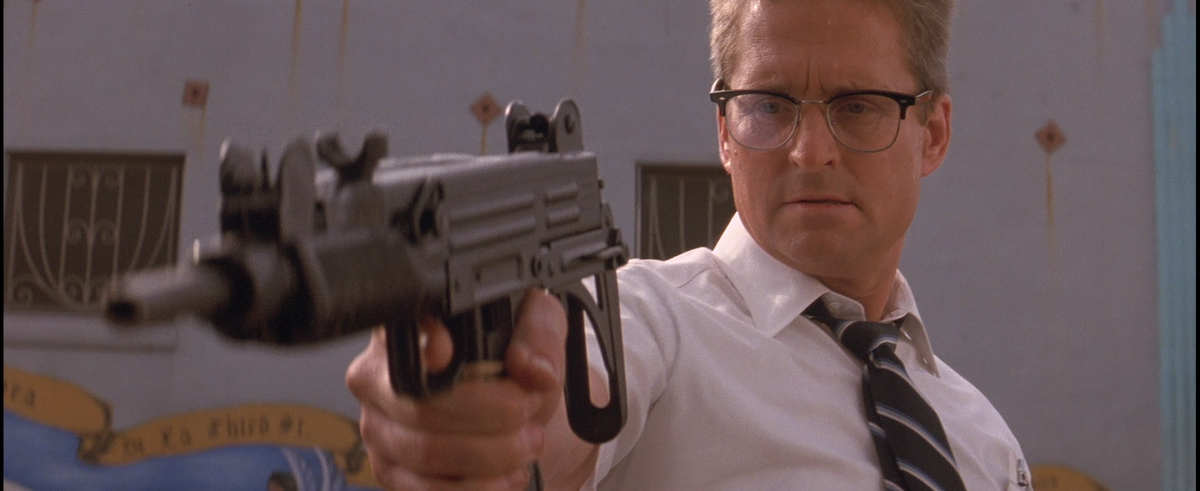 Если образ Фостера вызывает у меня двоякие ощущения с точки зрения драматургии, то работа Майкла Дугласа - только самые горячие, восторженные похвалы. Роль "белого воротничка" Фостера - карьерный риск для Дугласа. В 80-е и начале 90-х Дуглас - харизматичный искатель приключений в "Романе с камнем" и "Жемчужине Нила", финансовая акула с "Уолл-Стрит", герой легендарных эротических триллеров "Роковое влечение" и "Основной инстинкт", бескомпромиссный коп в стильном боевике "Черный дождь". И вдруг - нелепый, жалкий лузер в поношенной одежде и дырявых туфлях, нарочито асексуальный очкарик с дешевой стрижкой "под бобрик".