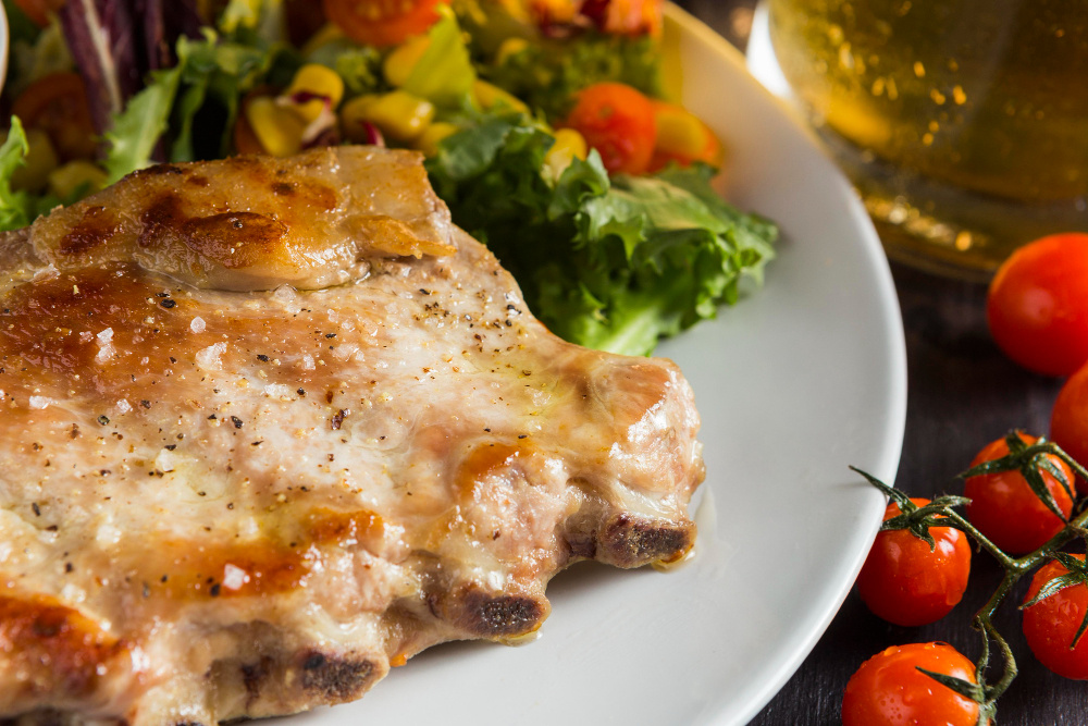 - Запекайте 20-25 минут в зависимости от толщины отбивных. Подавайте горячими, полив соком и маслом, которые выделились на противне.