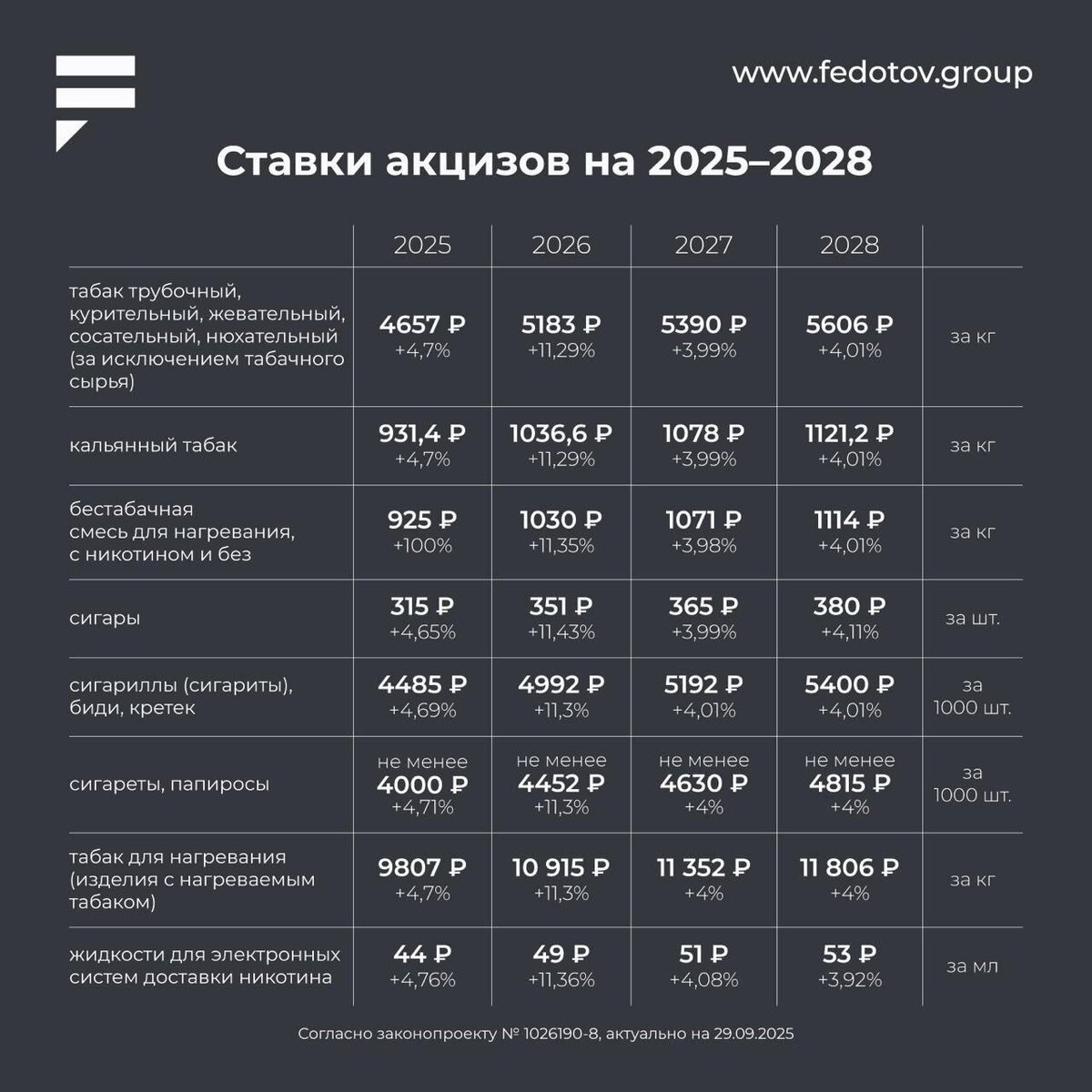 Новые ставки акциза на табачную и никотинсодержащую продукцию на 2025–2028 В таблице — акцизы на сигареты, сигары, папиросы, табак для кальяна и другие категории. Обратите внимание: • по сигаретам формула расчета слишком объемная, поэтому мы приводим только минимальный порог; • для кальянного табака ставка указана уже с учетом уплаты акциза за массу табачного сырья 20%. В прошлом проекте бюджета рост акцизов на 2026 год был запланирован на уровне около 4% по сравнению с 2025. Однако новые цифры показывают, что с 1 января 2026 года ставки увеличатся сразу на 11,3%, а уже в 2027 и 2028 годах вернутся к темпам роста порядка 4% в год. Это означает более резкий скачок налоговой нагрузки в 2026 году, чем ожидалось ранее. Полный перечень актуальных ставок можно найти в полном тексте законопроекта. Получить консультацию | Дать буст | Попасть в Retail Expert