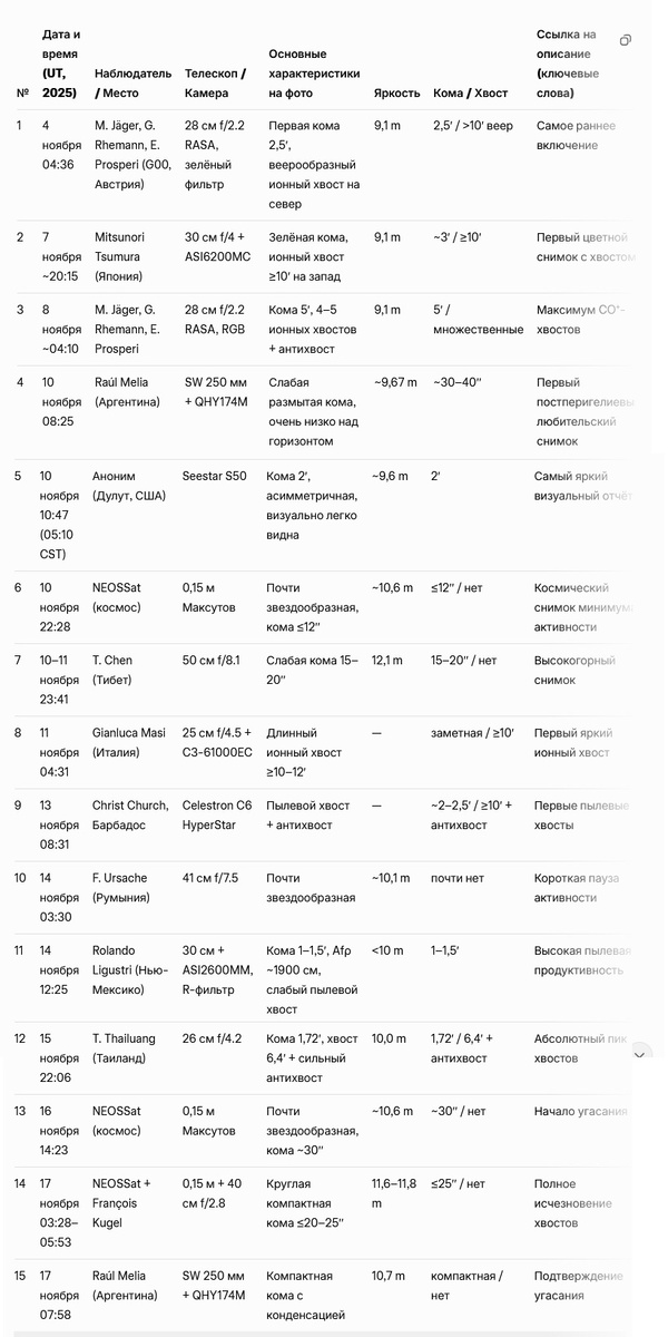 Вывод: если бы у 3I/ATLAS был настоящий кометный хвост, он был бы виден на профессиональных снимках так же отчётливо, как у всех перечисленных комет.
