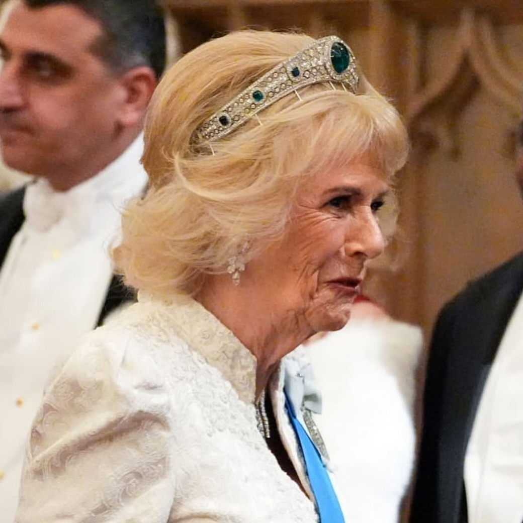 В Виндзорском замке прошёл дипломатический приём, на нём присутствовали члены королевской семьи: Король Карл |||, его сын принц Уэльский и королева-консорт Камилла, супруга короля. Глазам своим не поверила, взглянув на фото Камиллы! Гревильский изумрудный кокошник ,,восседал" на её голове! Тот самый, в котором принцесса Евгения венчалась с Джеком Бруксбэнком в чвсовне Святого Георгия. После свадьбы тиара Greville Emerald Kokoshnic и свадебные серьги Евгении с изумрудами и бриллиантами были выставлены в Виндзорском замке и их никто не видел. Видимо Камилла про тиару вспомнила. До свадьбы принцессы Евгении этот кокошник никто не надевал, поэтому он ассоциировался именно с ней. Это всё-равно что тиару,, Узелки любви", которую носит регулярно принцесса Кейт Уэльская, надела бы сейчас всё та же королева Камилла. Кокошник был изготовлен в 1919 году для миссис Гренвиль компанией Busheron. Кокошник выполнен из платины с многочисленными бриллиантами, в центре его установлен массивн