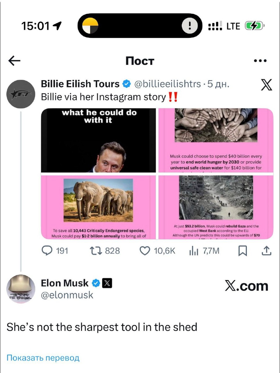 Илон Маск ответил на выпад певицы ртом Билли Айлиш, которая назвала его «жалким трусом» в своих историях. Напомним, она очень расстроена тем, что Илон Маск не хочет решить все мировые проблемы за свой счёт. Миллиардер ответил: «She’s not the sharpest tool in the shed», что переводится как: «Она не самая умная». Ну, в общем-то, другого ответа мы и не ждали. @lobushkin