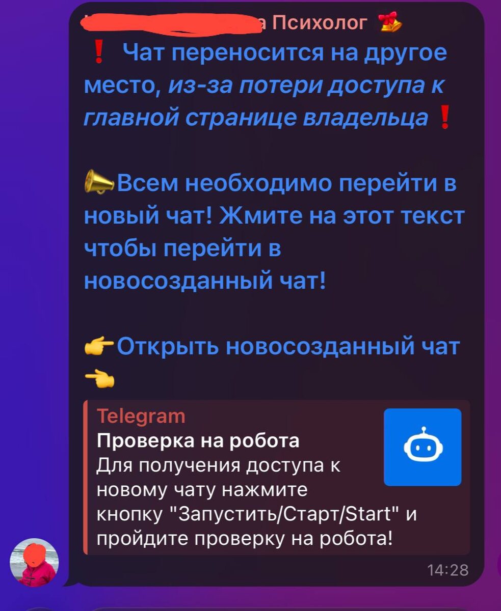 Очередной вид мошенничества в групповых чатах в Telegram Пользователь — скорее всего, взломанный аккаунт, принадлежащий другому человеку, — оставляет в крупном групповом чате сообщение, якобы «чат переносится на другое место из-за потери доступа к странице владельца». Сообщение кликабельно, гиперссылка ведет в бота с невнятным юзернеймом. Я запустила бота из интереса, но нажимать на кнопку и переходить по ссылке дальше не хочу. Хотя на самом деле и запускать бота не следовало, но очень уж хотелось проследить дальнейший путь обмана. Подозреваю, дальше пользователь оказался бы в окне авторизации, где нужно было бы ввести данные своего аккаунта Telegram и благополучно потерять его. ___ Тем временем, в Сбербанке признают, что снизить уровень финансовых потерь от телефонного мошенничества не удается. И я думаю, на самом деле это касается не только телефонного мошенничества, а вообще любого вида. Печальная поговорка «лох не мамонт…» отражает суть проблемы несколько однобоко. Дело не в л
