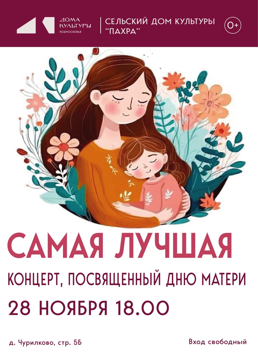 ✨ Приглашаем всех на праздничный концерт, посвященный международному Дню матери, 🚫 Возраст: 0+ 📆 28.11.2025🕒18:00 🏢 Сельский дом культуры (СДК) «Пахра» 📍 г.о.Домодедово, дер.Чурилково, ул.Чурилково, д.5Б 💰 Вход свободный❗️ ✅ Мероприятия Домодедово https://dzen.ru/id/66f10385cc4c5a16f7b5fb02 http://vk.com/domodedovo_events http://dzen.ru/domodedovo_events