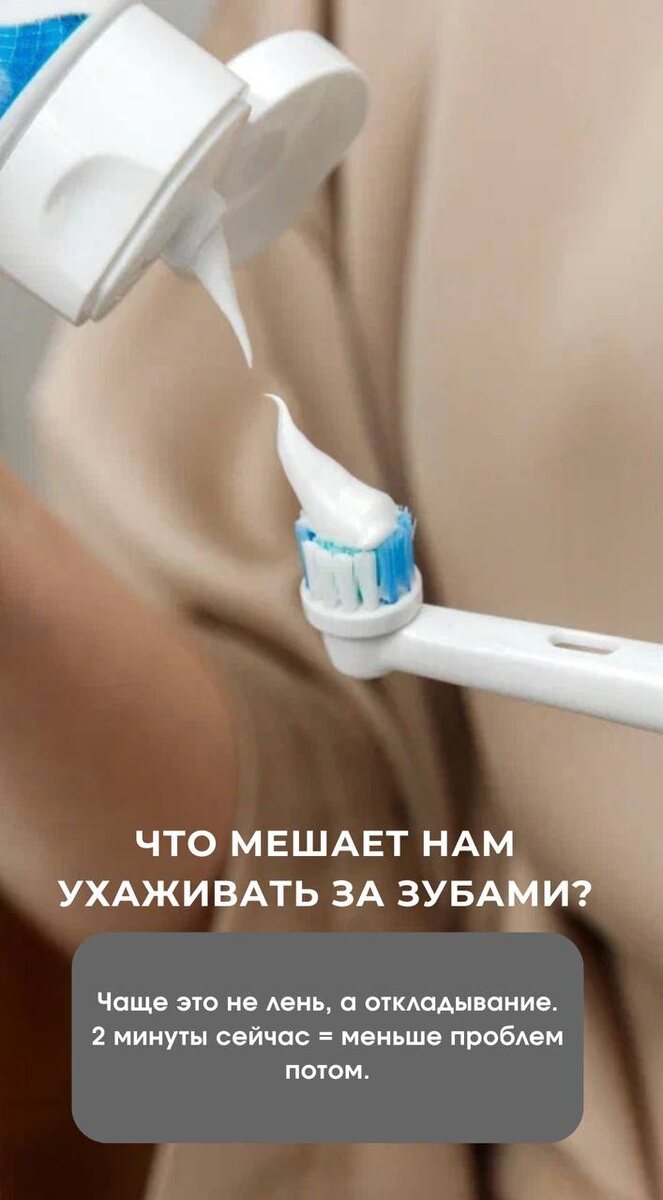 Часто то, что мы называем ленью — это на самом деле что-то другое. Что мешает нам ухаживать за зубами: •Мы откладываем "на потом", надеясь, что проблема не появится •Не видим срочности — ведь зубы пока не болят •Думаем "один раз пропущу — ничего страшного" •Не хотим думать о неприятных последствиях Звучит знакомо? Что помогает изменить ситуацию: ✔️ Осознание выбора 2 минуты ухода сейчас или часы лечения потом — решаете вы. ✔️ Понимание последствий Пропущенная чистка = бактерии работают всю ночь над вашей эмалью. ✔️ Принятие ответственности Никто не позаботится о ваших зубах лучше, чем вы сами. ✔️ Простые привычки Привяжите чистку к другому ритуалу — после душа, перед сном с книгой. Главное: Забота о себе — это не обуза. Это проявление любви к себе и своему будущему. Ваши зубы скажут спасибо 💙