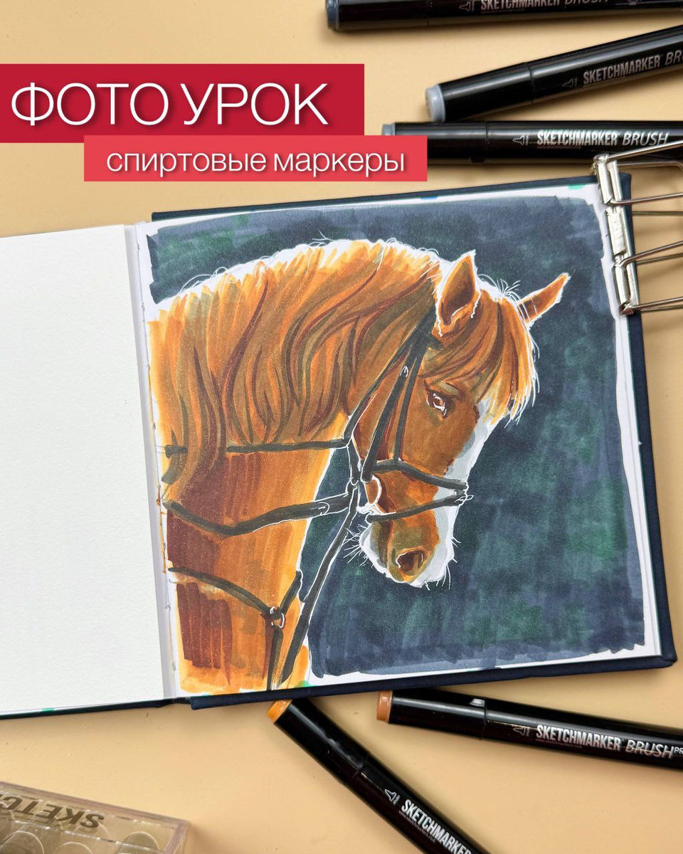 ⭐️ Встречайте новый фото урок от Dari Art! Сегодня мы приглашаем вас нарисовать грациозную лошадь спиртовыми маркерами 🧩 Приготовьте материалы: ✔️ Бумага для маркеров (в уроке используется скетчбук с двухсторонней бумагой для маркеров от Малевичъ, товары для художников (http://t.me/maleviches_brand)) ✔️ Спиртовые маркеры (в уроке используются маркеры SKETCHMARKER.rus (https://t.me/sketchmarkersketchclub) : оранжевый-О53, коричневый-О71, темно-коричневый-BR30, зеленый-G111, светло-серый-SG5, серый-SG3, темно-серый-CG1) ✔️ Простой карандаш и ластик ✔️ Белая ручка для бликов #фотоурок_dariart Переходим к созданию рисунка: 🐴 Этап 1: Начинаем с карандашной разметки. Простыми формами находим объем головы и шеи лошади, затем условно намечаем уши, нос и сбрую. 🐴 Этап 2: Теперь уточним рисунок. Прорисуем все детали, ориентируясь на референс. 🐴 Этап 3: Переходим к цвету. Оранжевым маркером закрашиваем весь объем лошади, не забывая оставить белое пятно и белые блики. Коричневым усиливаем объ