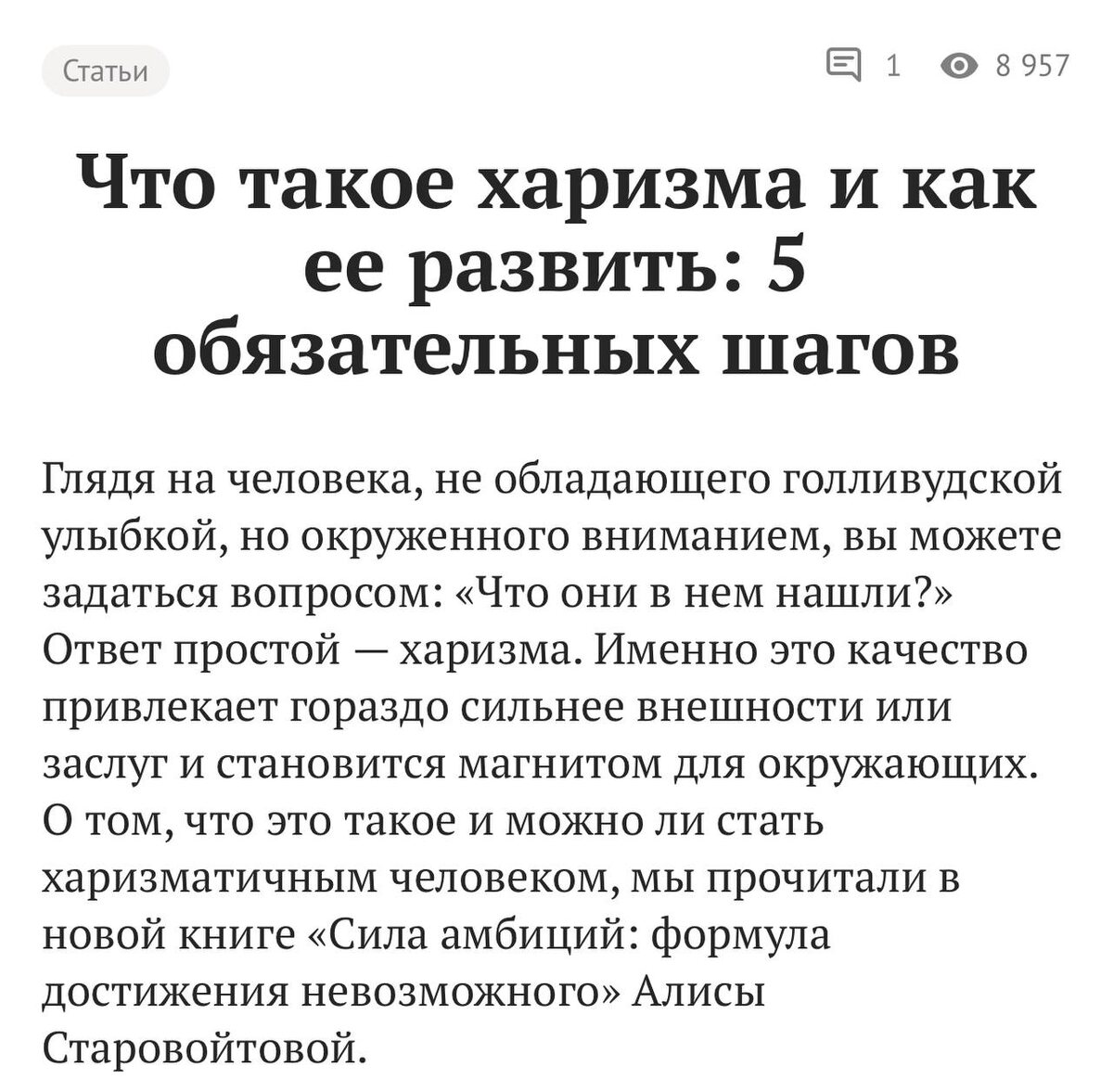 Мою статью прочитали почти 9 000 человек 😱 Публикация о харизме на Psychologies собрала именно такое количество откликов. Для меня это яркий сигнал о том, как много людей не просто интересуются харизмой, а по-настоящему осознают её важность в жизни и карьере. Они готовы действовать, а не просто мечтать 🔥 Мы с вами дважды погружались в эту тему на «Харизма-завтраках». Я видела, как меняются глаза участников, когда они на практике открывают в себе новые способности! Если вы всё ещё спрашиваете: «Харизма — это дар от природы или навык?», то ответ ждёт вас в статье 😉 Чуть не забыла! В статье каждого ждёт встроенный тест на вашу харизматичность (его уже опробовали тысячи) и выжимка мощных техник из мировой практики. ➡️Прочитать и пройти тест по ссылке
