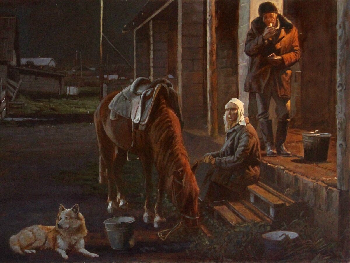 Автор - Андрей Подшивалов, о нём я рассказывала в статьях "Увидеть край свой на картине". На этот раз я ничего специально не искала, просто листала ленту в "ОК", увидела в одной группе подборку картин этого художника, стала просматривать - и вот оно, ещё одно открытие! Тёмные тона, вечерние сумерки, конец лета или начало осени. Уставшие люди, рядом лошадь и собака, вокруг какие-то неприглядные строения... Грустновато, мрачновато. Но так всё знакомо-знакомо!.. 😮 Стоп, так это же узянская ферма! А на заднем плане проглядывают крыши домов нашей улицы Доменной! В частности, длинная светлая крыша - это крыло здания детского дома, и огоньки на втором этаже светятся. На противоположной стороне дороги - другие дома (вернее, только их крыши видны), все на положенных местах, художник предельно точен в деталях. Эх, если бы ещё чуть правее сместить ракурс, тогда бы и крыша нашего дома оказалась видна!.. Задала в сети поиск по изображению, и выяснилось, что картина написана в 2015 году, называетс