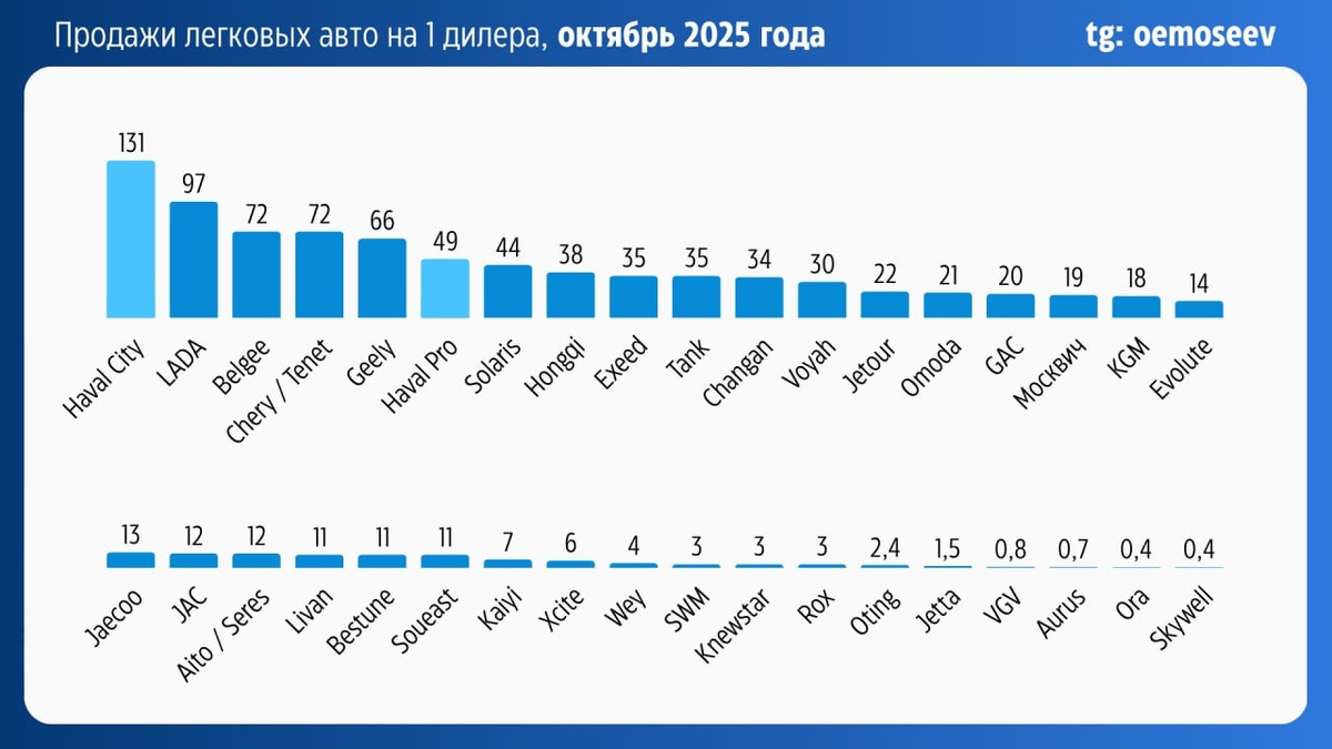 Независимый эксперт Олег Мосеев, когда-то возглавлявший ассоциацию российских дилеров, подсчитал, сколько машин в среднем продали автосалоны в октябре. В расчете на марки. Статистика эта сложнее, чем может показаться, потому что зачастую в одном шоуруме работают менеджеры сразу двух или нескольких брендов. "В данном случае имеются ввиду продажи на один дилерский центр, не физическое здание. Если Haval разделен на две сетки – City и Pro, то Changan без выделения Uni в силу того, что дилеры двух суббрендов занимаются перекрестными продажами", - пояснил Мосеев. Упомянутый Haval City и стал самым успешным - каждый такой салон в среднем реализовал по 131 машине. Очевидно, что у кого-то из дилеров объем хуже этого показателя, у кого-то лучше, но, скорее всего, выше минимума в 50 машин. Столько, по мнению эксперта, необходимо продавать бренду "для успешности" - 600 единиц автомобилей на одного дилера в год, или 50 в месяц. Преодолели эту планку всего 5 марок, если считать вместе Chery и T