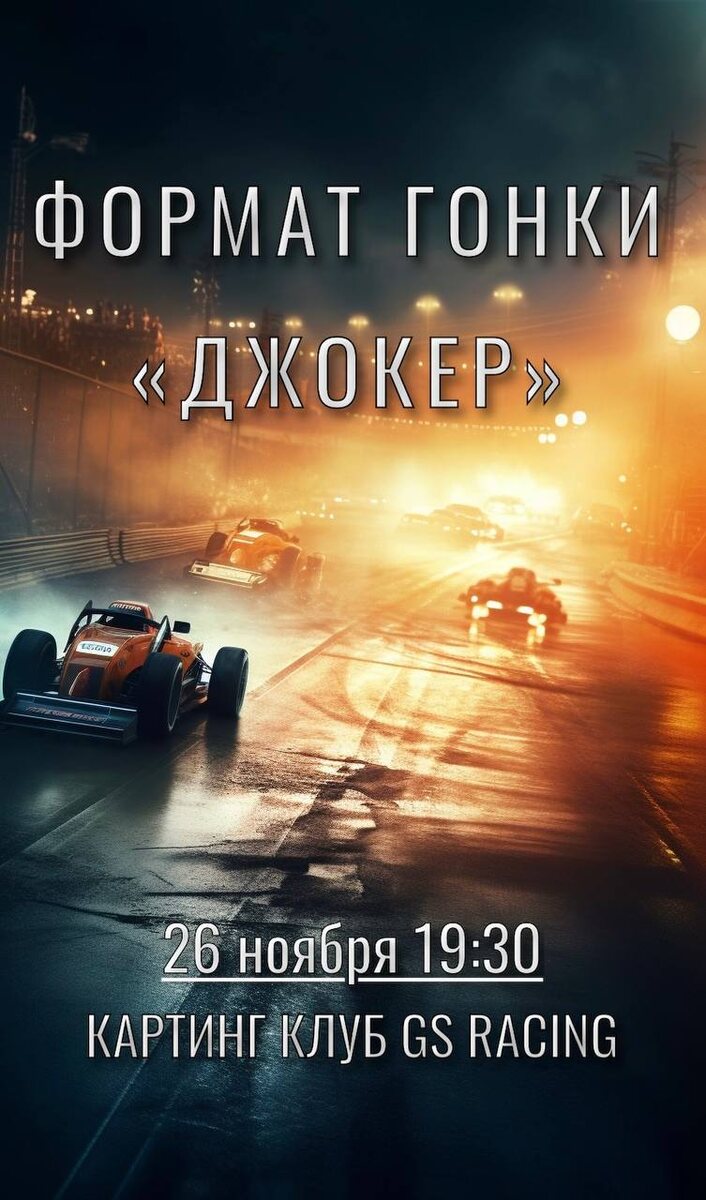 Друзья, внимание! Мы долго готовили сюрприз и наконец раскрываем карты 🎲👇🏼 26 ноября в картинг-клубе GS Racing стартует уникальная гонка с новым форматом «Джокер»!🏎️🔥 Друзья, внимание! Мы долго готовили сюрприз и наконец раскрываем карты 🎲👇🏼 ✅ Что ждет участников? Впервые в истории клубных гонок мы предлагаем абсолютно новый формат — «Джокер». Это значит, что на каждом этапе участники смогут воспользоваться специальными возможностями, влияющими на итоговую позицию в гонке. Ваша задача — грамотно распорядиться этими бонусами и показать лучшее время⏱️🫡 ⏳ Время старта: сбор участников в 19:30, начало гонки — ровно в 20:00. 📍Где всё произойдет? Картинг-клуб GS Racing. Адрес клуба: МО, Пушкинский район, п.Лесной, ул. Пушкина 2А стр 4. Присоединяйтесь к нам и испытайте новые ощущения в картинге! Запись открыта, а места ограничены. Скорее звоните нам или пишите!🔥 📞 +7 (925) 656-67-67 Регистрируйтесь скорее, чтобы успеть поучаствовать в самой захватывающей гонке сезона!?
