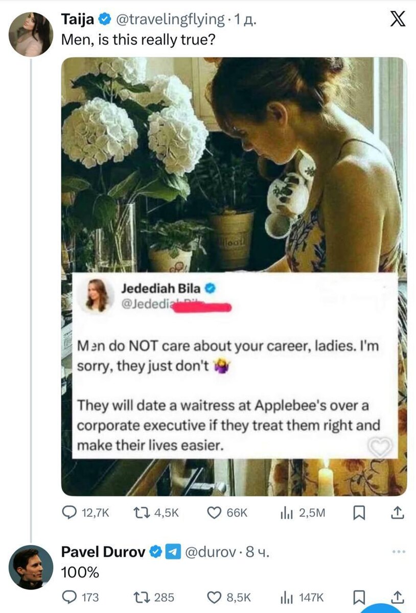 Павел Дуров заявил, что мужчины предпочитают простых девушек-официанток, а не бизнес-леди с карьерой. Так создатель Telegram ответил девушке в соцсети X, которая опубликовала такой пост: «Мужчинам не интересна ваша карьера, девушки. Извините, но это правда так. Они лучше будут встречаться с официанткой из Applebee чем с корпоративным директором, если она обращается с ним хорошо и делает общую жизнь лучше». Девушка спросила «Мужчины, это правда?». Дуров ответил: 100%. 📍 Подписывайтесь на Инфо24 | Прислать новость