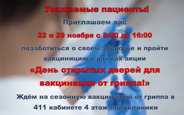 #Анонсы Уважаемые учалинцы! 22 и 29 ноября в рамках акции «День открытых дверей по проведению вакцинации от гриппа» приглашаем вас сделать прививку. Вы сможете пройти вакцинацию и получить подробную консультацию специалистов о необходимости прививок и профилактике сезонных заболеваний. Г.Учалы, ул. Муртазина, д.29, поликлиника, каб. 411. Время работы: с 8 до 16 часов. Источник https://uchaly102.ru/?p=111775