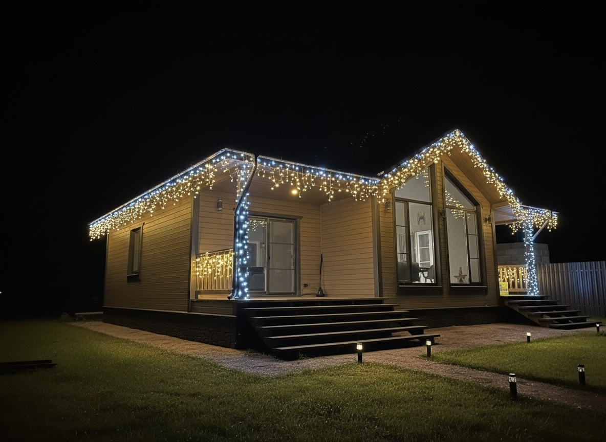 Архитектурная подсветка с гирляндой типа «бахрома» давно стала одним из самых эффектных способов оформить загородный дом в зимний период. Она подчёркивает линии крыши, добавляет объём, делает фасад более выразительным и сразу создаёт атмосферу праздника. Но чтобы подсветка смотрелась гармонично, а сама гирлянда служила долго, важно правильно выбрать её параметры — от длины до цвета и шага нитей. Главное правило: длина гирлянды должна совпадать или слегка превышать длину участка, который вы планируете подсвечивать. Чаще всего бахрому вешают по периметру крыши, поэтому расчёт прост: измерьте внешний периметр карнизов. Нюансы, которые важно учитывать: Шаг нитей — это расстояние между вертикальными свисающими полосами. От него зависит плотность и визуальный эффект подсветки. Оптимальные варианты: