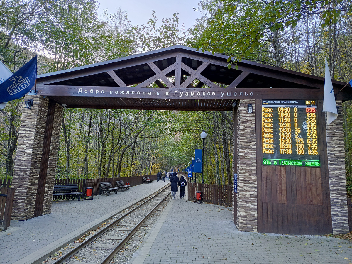 Сейчас прогулка на паровозике- аттракцион для туристов, а раньше эта дорога являлась частью Апшеронской железной дороги, которая была крупнейшей узкоколейкой на территории России и бывшего СССР. Дорога строилась в 1920-1930 годах силами заключённых для транспортировки древесины, а также использовалась как пассажирская. Протяжённость её составляла 59 км, которая с течением времени постепенно уменьшалась. Причин было множество- лесозаготовки сократились, кое-где проложили асфальтированные дороги, не хватало средств на содержание, периодически происходили природные катаклизмы- наводнения, оползни, снегопады. Сейчас паровозик с туристами проходит только 1,7 км, от станции "Гуамка" до станции "Урочище Монахово". Время в пути около 20 минут, в течение которых аудиогид будет рассказывать об ущелье, его истории и достопримечательностях. Вот на таком паровозике мы путешествовали, листайте