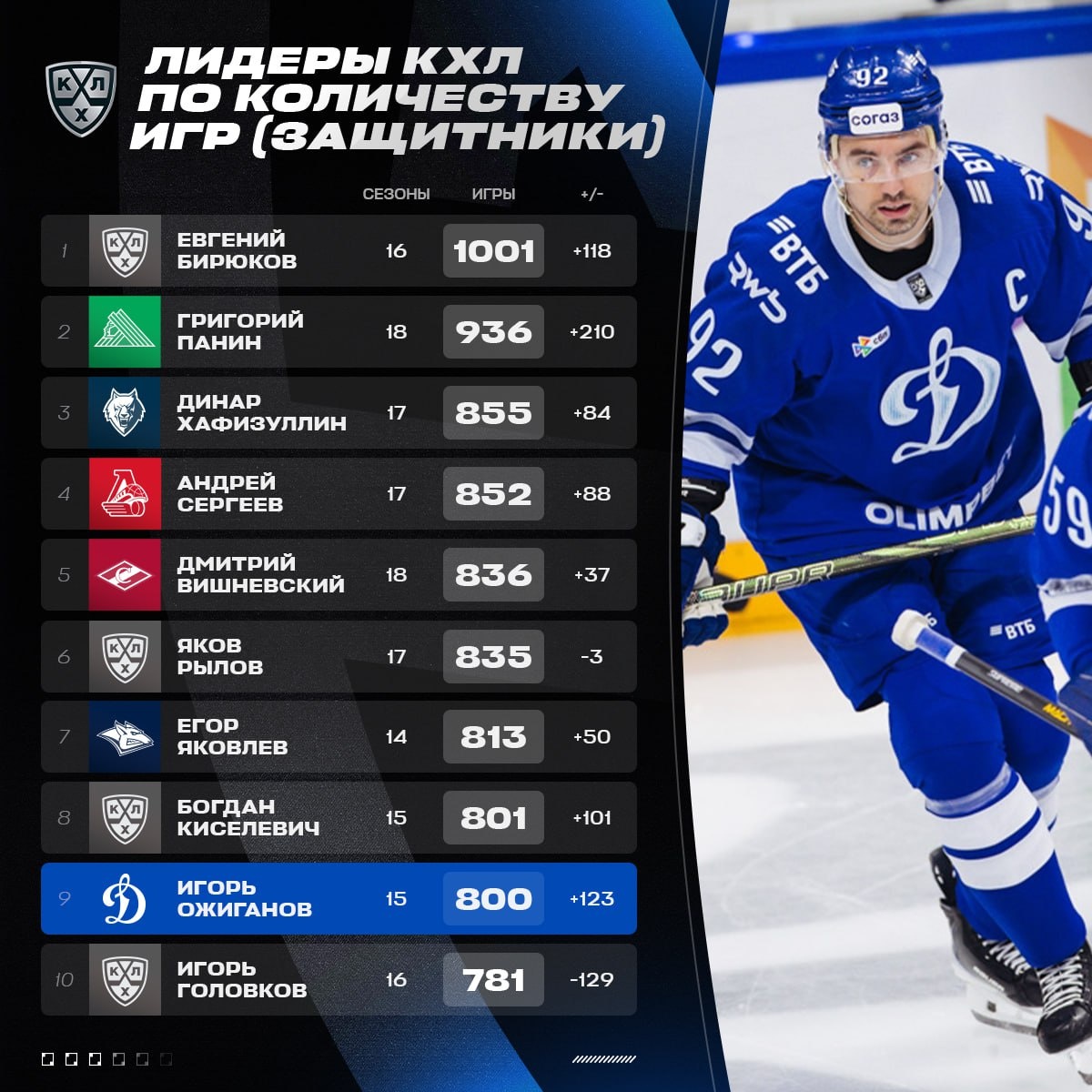В истории КХЛ только девять защитников провели 800+ матчей. 🔵 Игорь Ожиганов один из них.