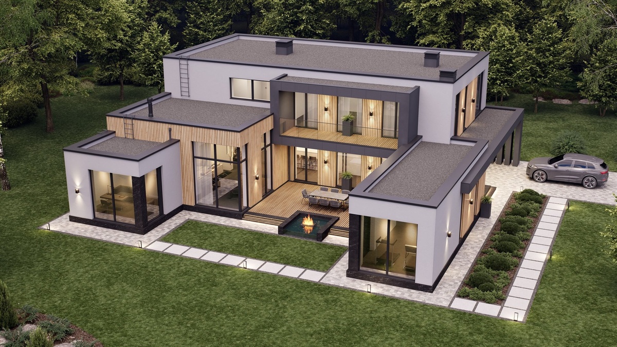 Современный двухэтажный дом с внутренним двориком Дом из газобетона площадью 471 м² создан для семьи, которая ценит пространство, свет и архитектурную логику. Его форма имеет модульность, но выразительна: строгие линии, большие витражи и сбалансированные пропорции делают дом частью ландшафта, не перегружая визуально участок. Архитектура строится на контрасте материалов и фактур. Светлая штукатурка служит нейтральным фоном, деревянные ламели добавляют тепла, а тёмные вставки и цоколь из керамогранита подчёркивают графику фасада. Смещение второго этажа вглубь позволяет сохранить лёгкий силуэт и добавить уединённости спальням. Архитектурный проект М494 #проектм494