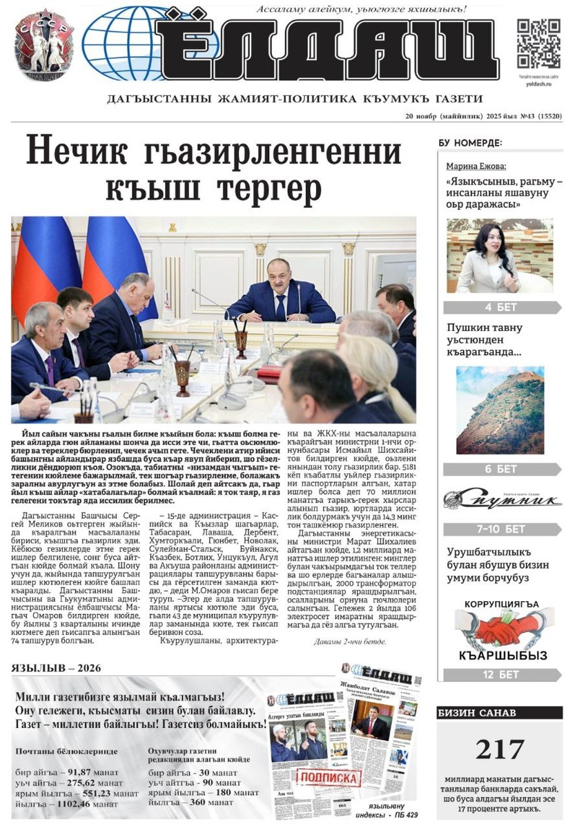 Вышел новый номер республиканской газеты «Ёлдаш» №43 от 20 ноября 2025 года. Читайте в номере: 🔻Какова готовность – покажет зима. Г.Конакбиев. 🔻Прямой эфир Главы Дагестана. Г.Конакбиев. 🔻Юношей обучают защищать Родину. Х. Хайбуллаев. 🔻Доброта и участие- высшее качество человечества. П.Хайбуллаева. 🔻Участники СВО своим мужеством дополняют героизм отцов. 🔻Один из лучших защитников. К.Казимов. 🔻Когда оглядываешься с Пушкин горы. К.Караев. Спутник. 🔻У хорошего всадника и лошадь воспитанная. 🔻Полынь – судьба Мурада Аджи. 🔻Потеряла главное предназначение и смысл. А.Алиев. 🔻Борьба с коррупцией наш общий долг. П.Бекеева. 🔻Педагог, сумевший сохранить достоинство. М.-Р.Ибрагимов. 🔻Машина – чемпиону в подарок Н.Эндреева. 🔻Детская страница: Победители футбольной лиги. Н.Байболатов. 🔻Известные кумыки.Эльмурза Джумагулов. Эти и другие материалы читайте в новом номере газеты «Ёлдаш».