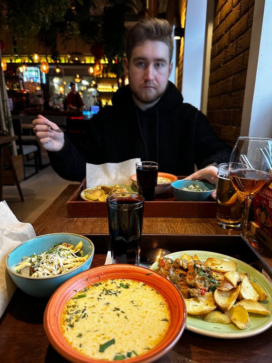 если что вот так наборчик из трех блюд выглядит, 350 рублей и морсик, сережин взгляд - бесценный)