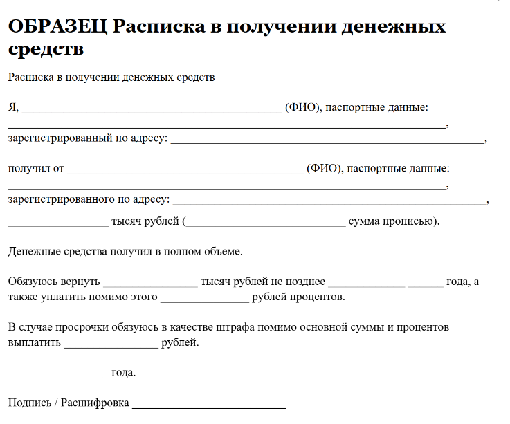Подтверждение факта получения денег. В тексте должна быть четкая формулировка о том, что заемщик действительно получил деньги. Например, «Я, Иванов Иван Иванович, получил от Петрова Петра Петровича денежные средства в размере...»