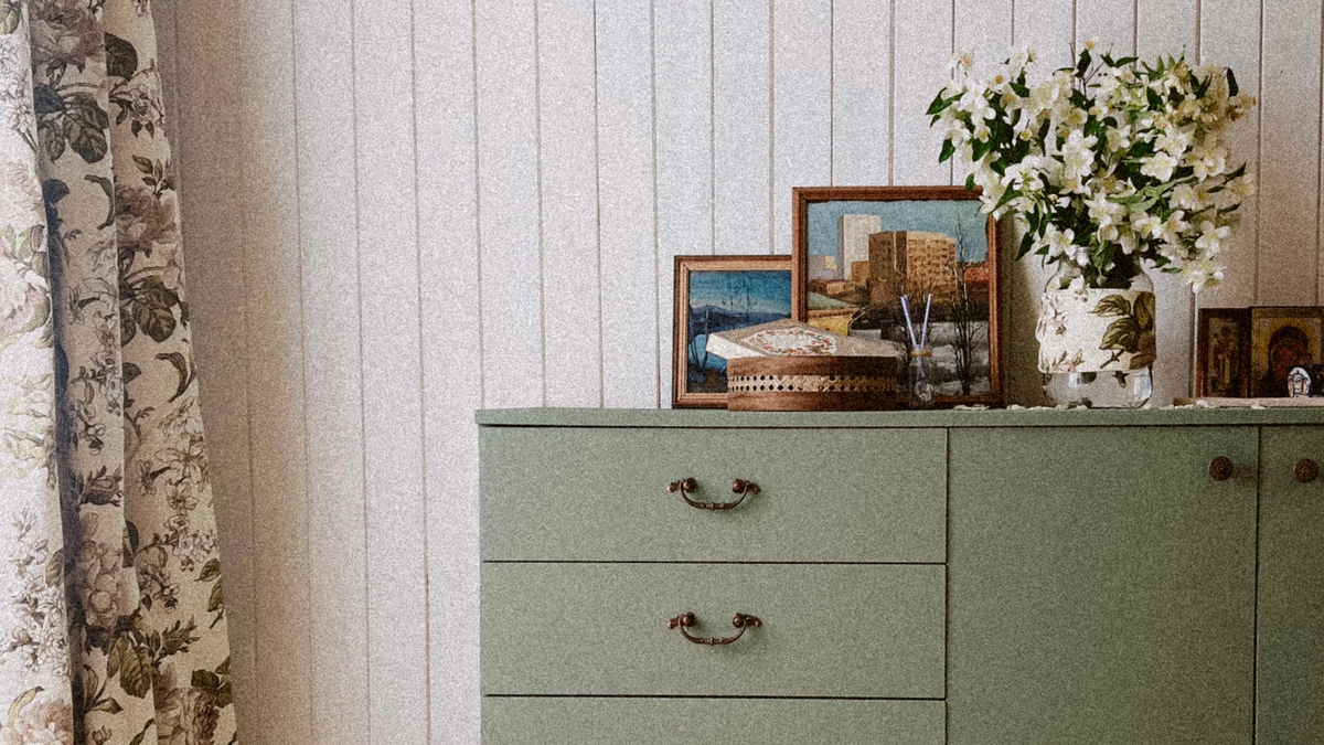 Иногда я ради удовольствия перекрашиваю мебель, и благодаря этому хобби некоторые предметы этого дома получили новый облик — например, буфет, спасённый из далёкой смоленской деревни. С одной стороны, краска меняет настроение мебели, а с другой — даёт свежесть и устраняет запахи вещей с историей, позволяя вдохнуть в них новую жизнь и не тратить лишние деньги на то, что вполне можно сделать (или переделать) своими руками.
