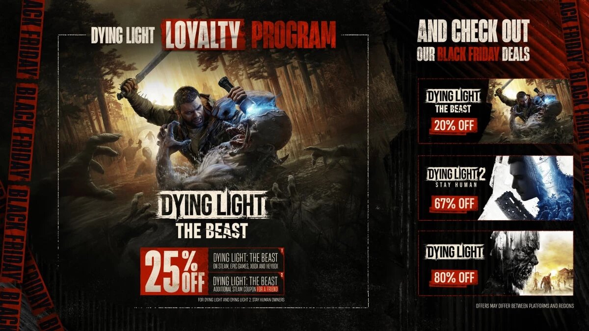 В знак признательности преданному комьюнити разработчик Techland представляет специальную программу лояльности для поклонников франшизы Dying Light. С 18 ноября по 2 декабря для всех владельцев оригинальной игры и сиквела Dying Light 2: Stay Human будет действовать эксклюзивная скидка 25% на новое издание Dying Light: The Beast. Особенностью программы стала возможность поделиться скидкой с друзьями. Все владельцы игр серии получат персональный купон на 25% скидку, который можно активировать через платформу Dying Light Outpost. Параллельно Techland присоединяется к распродажам Чёрной пятницы, предлагая всем игрокам общую скидку 20% на Dying Light: The Beast. https://youtu.be/qsqBCs7o5go