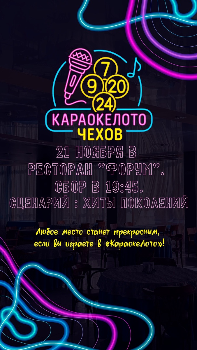 ✨ Караоке-Лото в Чехове 🎉 Пятница всё ближе — а значит, игра тоже! Уже готов(а) проверить свою удачу и голос? Тогда самое время зарегистрироваться на КараокеЛото! Мы соберёмся, чтобы петь, смеяться, выигрывать и… 🤫 Узнать, какая же команда станет обладателем специальной скидки вечера. Регистрация своей команды — это шанс. Но кому улыбнётся удача на этот раз? 🔗 Регистрируйся прямо сейчас — эмоции настоящие, а приз может достаться именно твоей команде. Не откладывай, места быстро заканчиваются! 🎶 КараокеЛото — играй, пой, побеждай! 📆 21.11.2025 🕛 20:00 🏢 Ресторан "Форум" 📍 г. Чехов, Советская площадь, д.2 💰 Цена: 1000 ₽ 🔗 Записаться: vk.me/karaokeloto_chv #КараокеЛотоЧехов #КараокеЛото #КлубУмногоОтдыха