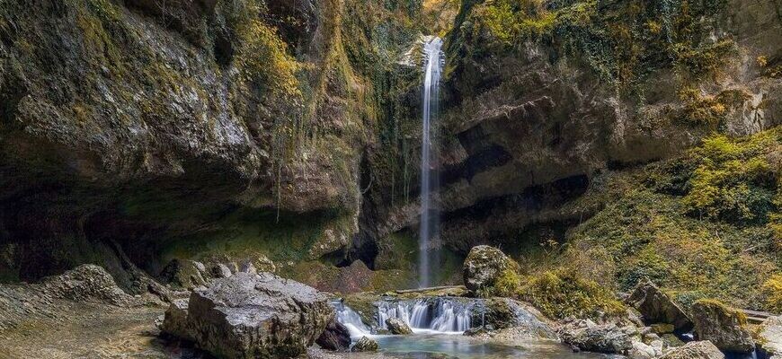 Водопад, окутанный тайнами и легендами. Природная достопримечательность, расположенная на территории Сочинского национального парка. Водопад, «рёв» которого слышно за километр. Как его только не называют… «Пасть дракона», «Глубокий Яр», «Воклюз», «Драконье логово». Но всё же самое популярное название дано в честь красивой легенды. Согласно ей, много столетий назад, на дне пещеры обитал дракон. Он использовал место в качество своего логова и попросту там спал. Ниспадающие струйки воды издалека кажутся похожими на дыхание. Мощное дыхание дракона. Вот водопад и прозвали «Пасть дракона». Находится этот красавчик на высоте 265 метров над уровнем моря. При этом высота водопада слегка превышает 40 метров. Визуально он состоит из двух частей: нижней и верхней. Обе сливаются в единое целое в чаше голубого водоёма. Нижняя часть бьёт из подземного прохода, которому дали название «Глубокий Яр». Этот проход идентичен с видом небольших пещер. Считается, что именно пещера служит главным источником р