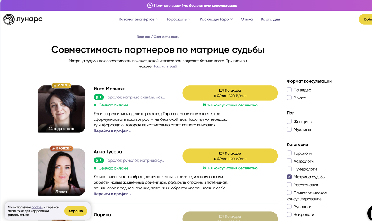 Пользователь вводит свои и партнерские данные, после чего получает подробную расшифровку: совместимость по энергетике, точкам притяжения и зонам конфликта. Интерфейс платформы интуитивно понятен, есть как краткие описания, так и расширенные платные отчеты. Lunaro подойдет как для поверхностного знакомства с нумерологией, так и для глубокого анализа взаимоотношений.