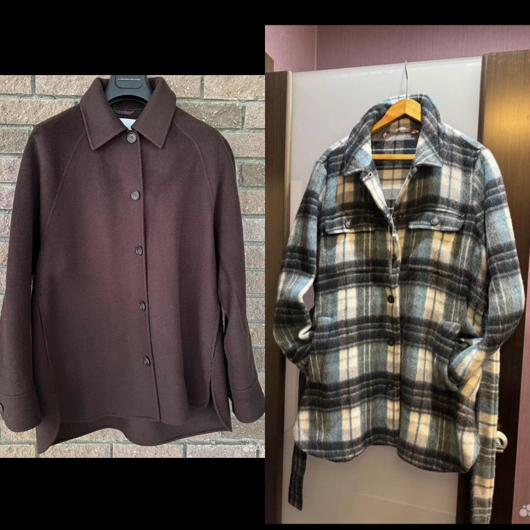 И еще хотела бы немножко продолжить тему верхней одежды икурток для размеров плюс сайз. Смотрите, вот выбрала примерно в одном стиле две куртки-рубашки, причем это куртки в одном размере 52, и материал у них схожий, и обе без подкладки. Ну вот глядя на них, вот лично у меня, создается впечатление, что рубашка на фото справа, пусть она у нас будет рубашка в клетку),кажется намного более объемной и как будто бы больше, чем рубашка на фото слева, будем называть ее коричневая рубашка). Хотя заявлено, что размер у них одинаковый. И вот самый прикол в том, что вот этот вот объём рубашка в клетку перенесёт на женщину, на которую будет надета. Здесь у меня основных претензий к этой рубашке две. Во-первых, вот сама расцветка. Вот вроде бы она тоже как будто бы в клетку, но есть ощущение, что она имеет ярко выраженные, четкие, достаточно широкие, горизонтальные полосы. Помните, в предыдущих постах я как раз отмечала, что на полупальто, которое тоже имеет вроде бы клетчатую расцветку, но у нег