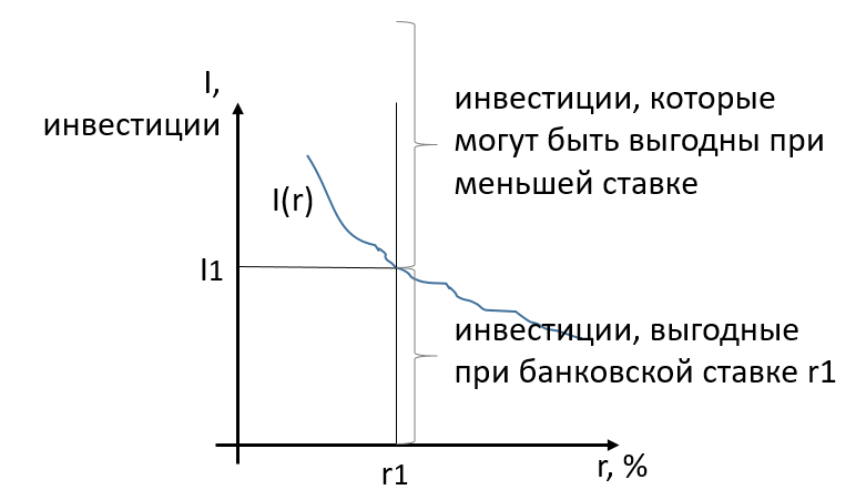 Допустим, у нас определено количество денег. Тогда предпочтение ликвидности определяет ставку r (по которой люди будут готовы оставить у себя именно такое количество). Дальше, эта ставка, совместно с графиком предполагаемой эффективности капитала, определяет размер инвестиций, которые совершат за этот период предприниматели (т.к. посчитают их экономически оправданными).
