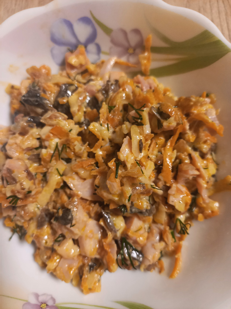 Всем привет! С наступлением холодов хочется уже более сытных салатов, не то, что летом...все бы поесть чего-то "легкого". Этот салат у нас в семье называют "Лисичка" . Салат имеет красивый ярко рыжий цвет. По вкусу салатик очень интересный и сытный. В интернете есть салат "Лисичка", но готовят его с корейской морковью и яйцом. Мой рецепт другой, хотя название такое же. Вот сейчас даже не помню от куда взялся рецепт, но готовим его уже давно, да и не суть. Главное он у нас "прижился" и очень нам нравится. Способ приготовления: Репчатый лук чистим, моем и нарезаем мелким кубиком. Обжариваем на растительном масле до золотистого цвета. Шампиньоны моем, нарезаем мелким кубиком, добавляем к луку.Жарим минут 10. Морковь моем, чистим, натираем на крупной терке. Добавляем в сковороду к грибам и луку. Подливаем еще немного растительного масла, жарим до мягкости моркови (7-10 минут). Содержимое сковороды остужаем до теплого состояния. Копченую куриную грудку нарезаем на небольшие кусочки. Сыр
