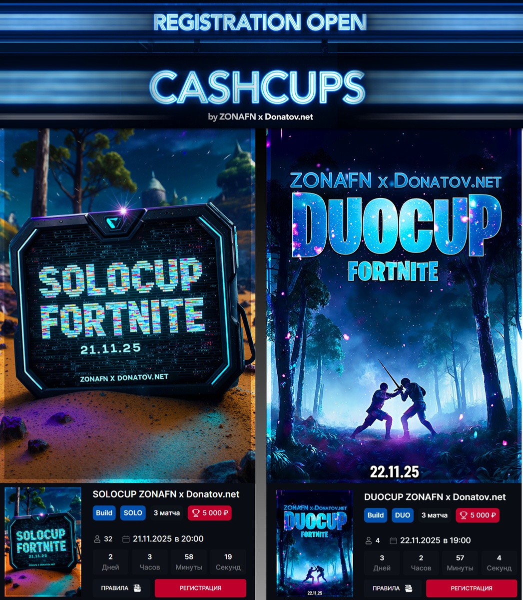 🏆 ZONAFN x Donatov.net — Solo|Duo CUPs #1 ⏰️ Дата и режимы: • SOLOCUP: 21 ноября 20:00 МСК| Solo • Build • 3 матча • DUOCUP: 22 ноября 19:00 МСК| Duo • Build • 3 матча ✅ Условия участия в турнире: • Подписаться на Зона Фортнайт • Подписаться на Donatov.net • Подписаться на Твина 🎁 Общий призовой фонд: 10000 рублей 🔥 Регистрация тут — app.ftoyd.com/tournaments/upcoming ℹ сайт с телефона не работает 🥑 Найти тиммейта — t.me/AvokadoTeamBot