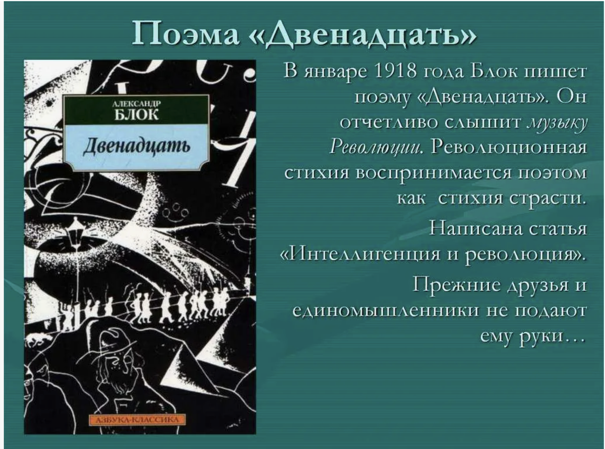 В январе 1918 года вряд ли автор поэмы мог объективно анализировать происходящие события: мы и спустя 108 лет спорим и высказываем разные точки зрения на это историческое событие. Блок с помощью музыки попытался передать свои ощущения, часто интуитивные, но, наверное, самые верные: не может бесконечно длиться хаос, человечеству нужна надежда, спасение