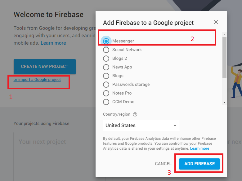 В этом руководстве показано, как перейти с GCM (Google Cloud Messages) на FCM (Firebase Cloud Messages). 1.) перейдите к https://console.firebase.google.com/ 2.) Нажмите -> или импортируйте проект Google 3.) Нажмите -> Добавить Firebase в свое приложение для Android 4.) введите название пакета вашего приложения и нажмите -> Добавить приложение 5.) загрузите и добавьте файл "google-services.json" в свое приложение 6.) Добавьте строки в ваши файлы build.gradle (два разных файла - будьте осторожны)