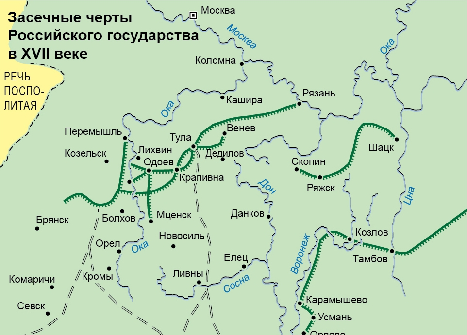 1. Большая Засечная Черта (1550-е – 1630-е). Самая мощная: почти 1000 км** от Волги до Днепра. Проходила по линии: Серпухов – Таруса – Тула – Белёв – Орёл – Курск – Белгород. Она закрывала основные направления татарских набегов: Муравский и Изыюмский шляхи.