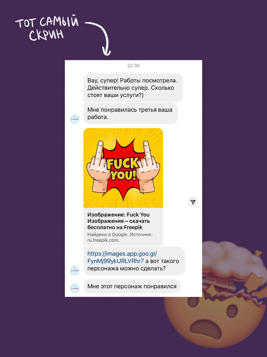 Признавайтесь, было у вас такое? Когда ты всеми силами оттягиваешь момент прямых продаж, потому что в голове крутится: «Не хочу навязываться... Сейчас пошлют... Буду выглядеть как спамер»? Уверена, у многих было! Это же классика жанра)) Недавно я об этом вспомнила и подумала — а почему бы не рассказать вам одну трешовую историю? 😈 С вас лайк 🩶, чтобы я знала, что вам такое заходит, с меня — фрилансерский треш в лучших традициях 🤣 Итак, 2023 год. Я только начала самостоятельно продвигать себя как иллюстратора и искать клиентов через рассылки. Какая была я: ▫️ Новичок в систематическом продвижении ▫️ Делаю первые робкие шаги ▫️ До ужаса боюсь писать незнакомым людям и что-то предлагать В тот период я как раз начала потихоньку делегировать и работать с ассистентами. Они и делали за меня рассылку. И вот, один обычный рабочий день... Момент ИКС. Ассистент присылает мне скрин. А там... такое, что я аж обомлела. Подробнее можете посмотреть на скрине, который я приложила к этому п