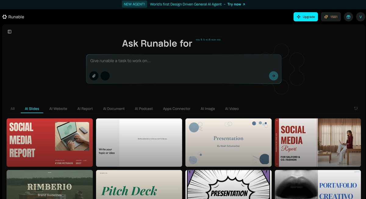 Для любителей AI-мультитулов Про Runable не много пишут, но потенциально это удобный агрегатор, который работает не от модели, а от типа задачи, платформа сама подбирает нужные модели и сервисы через свои интеграции. Внутри есть куча шаблонов для создания презентаций, видео, подкастов, документов и агентных воркфлоу. При регистрации через Google дают 1500 кредитов. #Agents@TochkiNadAI #presentation@TochkiNadAI