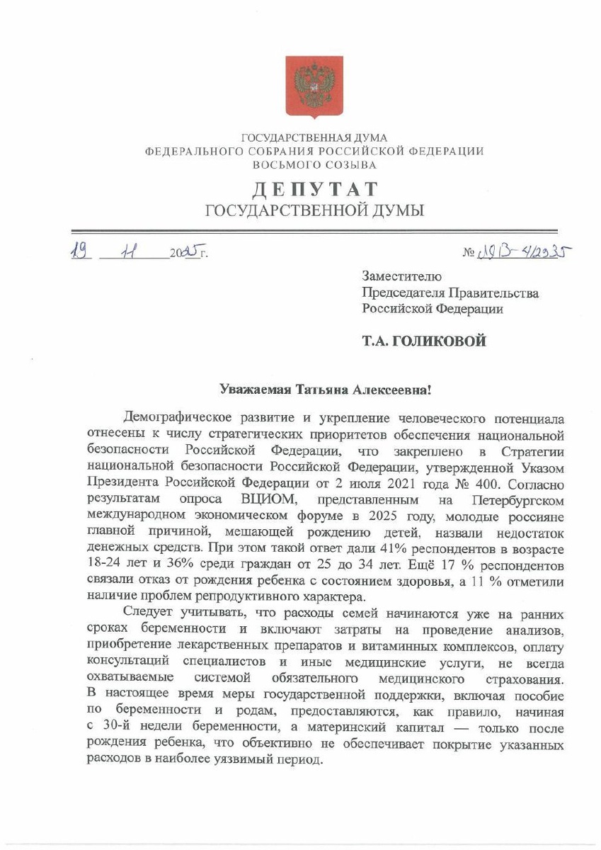 πΠ‘ΠΎΠ²ΠΌΠ΅ΡΡΠ½ΠΎ Ρ Π»ΠΈΠ΄Π΅ΡΠΎΠΌ ΡΡΠ°ΠΊΡΠΈΠΈ Β«Π‘ΠΏΡΠ°Π²Π΅Π΄Π»ΠΈΠ²Π°Ρ Π ΠΎΡΡΠΈΡΒ» Π‘Π΅ΡΠ³Π΅Π΅ΠΌ ΠΠΈΡΠΎΠ½ΠΎΠ²ΡΠΌ Π½Π°ΠΏΡΠ°Π²ΠΈΠ»ΠΈ Π²ΠΈΡΠ΅-ΠΏΡΠ΅ΠΌΡΠ΅ΡΡ Π’Π°ΡΡΡΠ½Π΅ ΠΠΎΠ»ΠΈΠΊΠΎΠ²ΠΎΠΉ ΠΎΠ±ΡΠ°ΡΠ΅Π½ΠΈΠ΅ Ρ ΠΈΠ½ΠΈΡΠΈΠ°ΡΠΈΠ²ΠΎΠΉ ΠΏΠΎ Π²Π²Π΅Π΄Π΅Π½ΠΈΡ Β«Π‘Π΅ΡΡΠΈΡΠΈΠΊΠ°ΡΠ° ΠΏΠΎΠ΄Π΄Π΅ΡΠΆΠΊΠΈ Π±Π΅ΡΠ΅ΠΌΠ΅Π½Π½ΡΡ