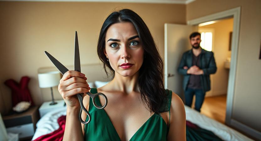 Она стояла посреди спальни, держа в руках портновские ножницы, и смотрела на него с таким спокойствием, которое могло напугать кого угодно. На кровати лежали три дорогих платья — бордовое, изумрудное и то самое, коктейльное, которое он купил ей на годовщину. Все три были аккуратно, методично разрезаны пополам. Не порваны в приступе истерики, а именно разрезаны — ровными, целенаправленными движениями.